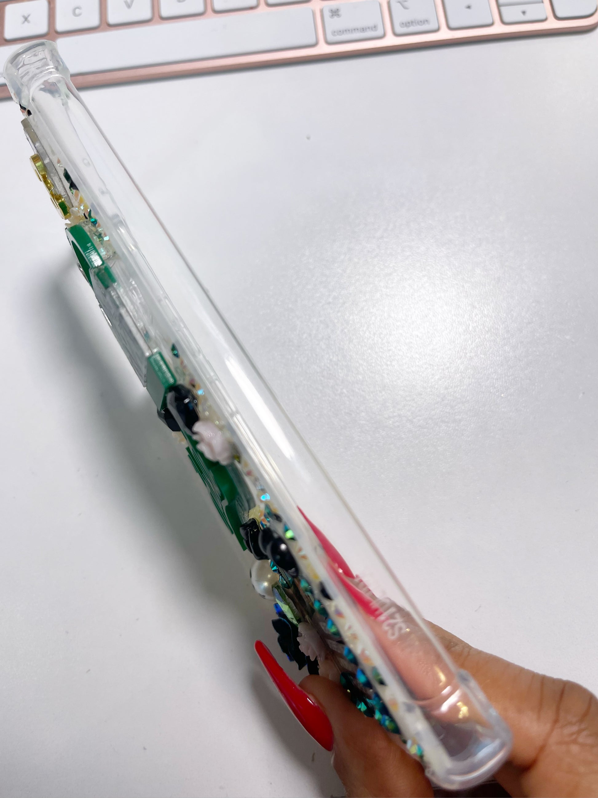 Custom Stoned Phone Case Ships today - Fully rhinestoned with custom laser cut inlays will get noticed. Oversized gems bring elegance and distinction. Protective shockproof bumpers allow everyday use. Pearl accents and beautiful floral pieces provide a shabby chic elegance.